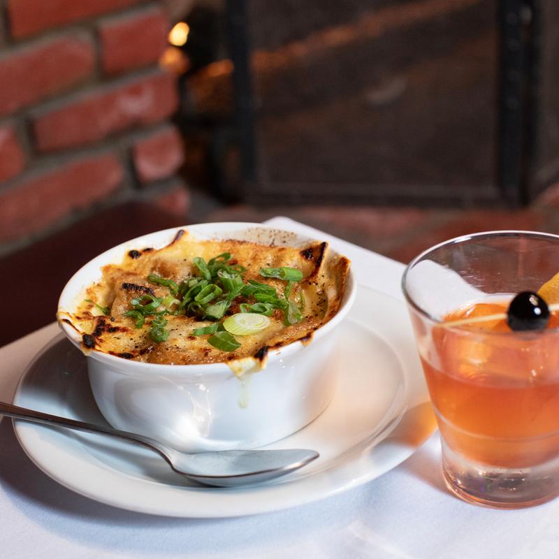 Veal broth, caramelized onions, gruyere, Emmental cheese, and garlic baguette.