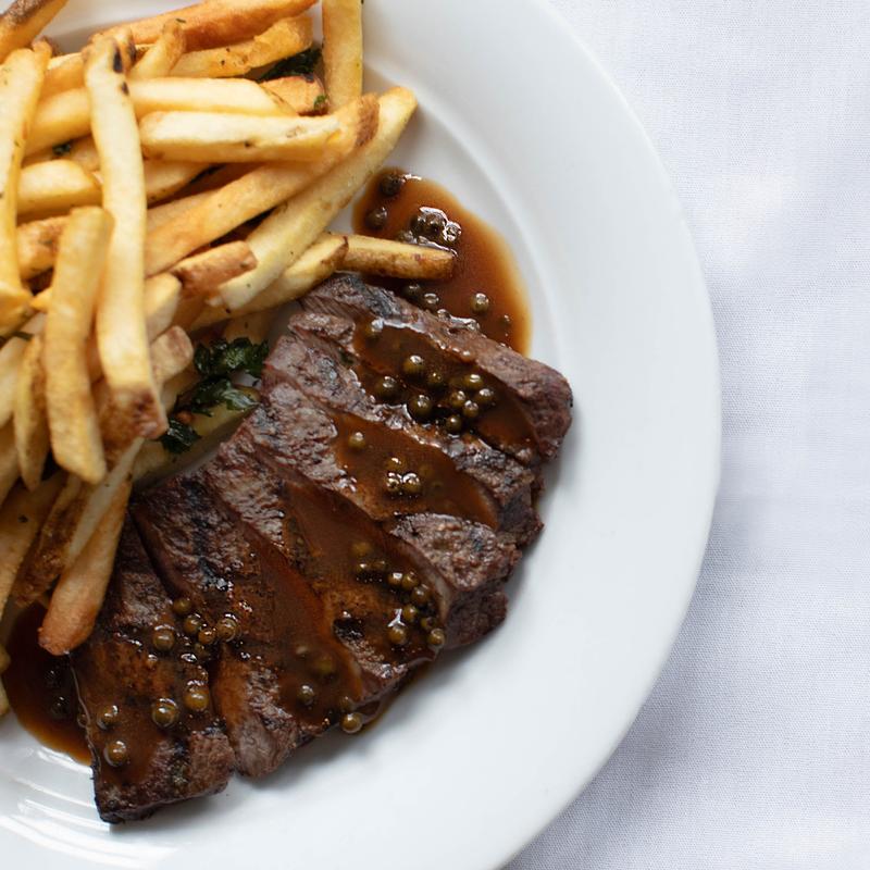 Flat iron steak, poivre vert, garlic herb fries
