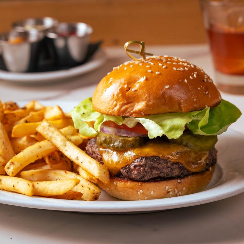 Smoked cheddar, red onions, butter lettuce, tomato, pickles, fancy sauce, and garlic herb fries.